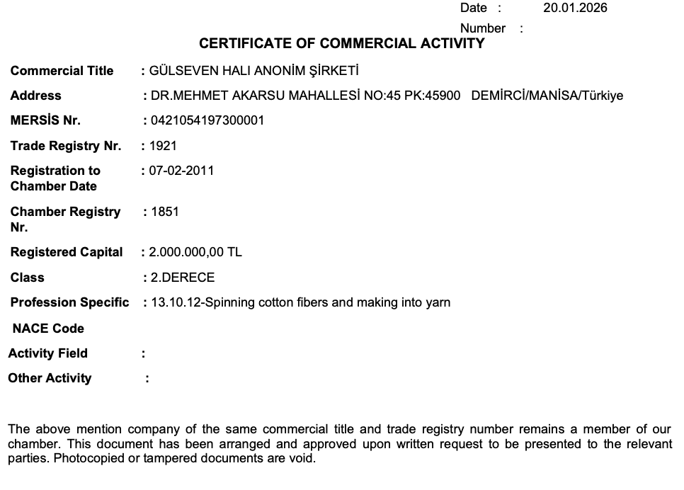 FAALIYET BELGESI (CERTIFICATE OF COMMERCIAL ACTIVITY)